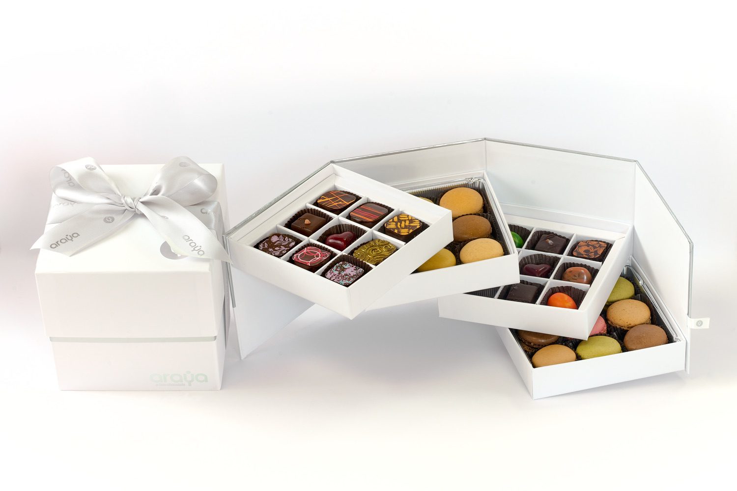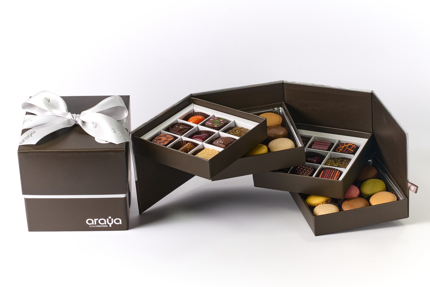 Explore our two best sellers products, chocolates and French macarons, combined in a beautiful four-tier, expandable gift box. Carefully picked, packaged, shipped fresh, and with utmost attention to detail.