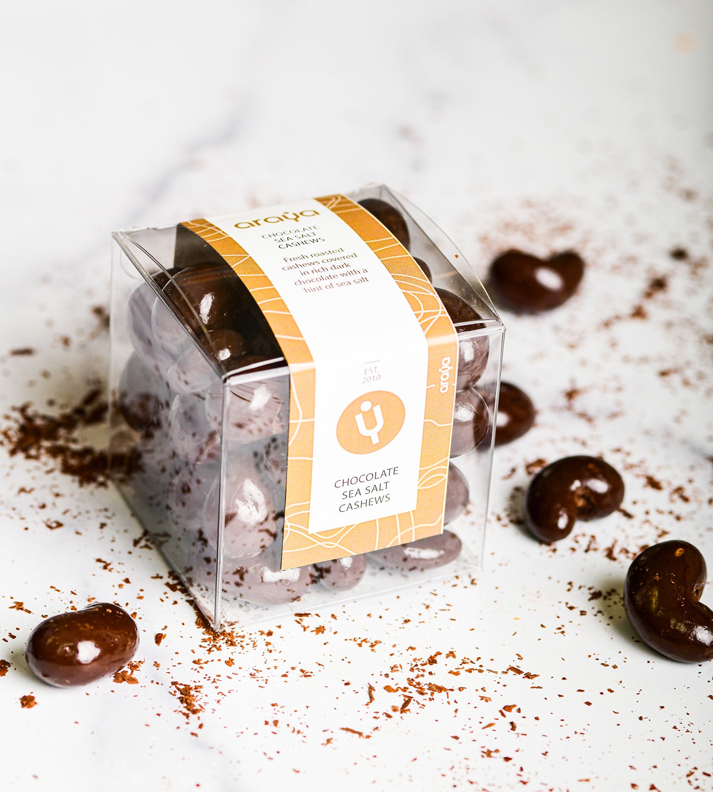 Fresh, roasted cashews covered in rich dark chocolate with a hint of sea salt.