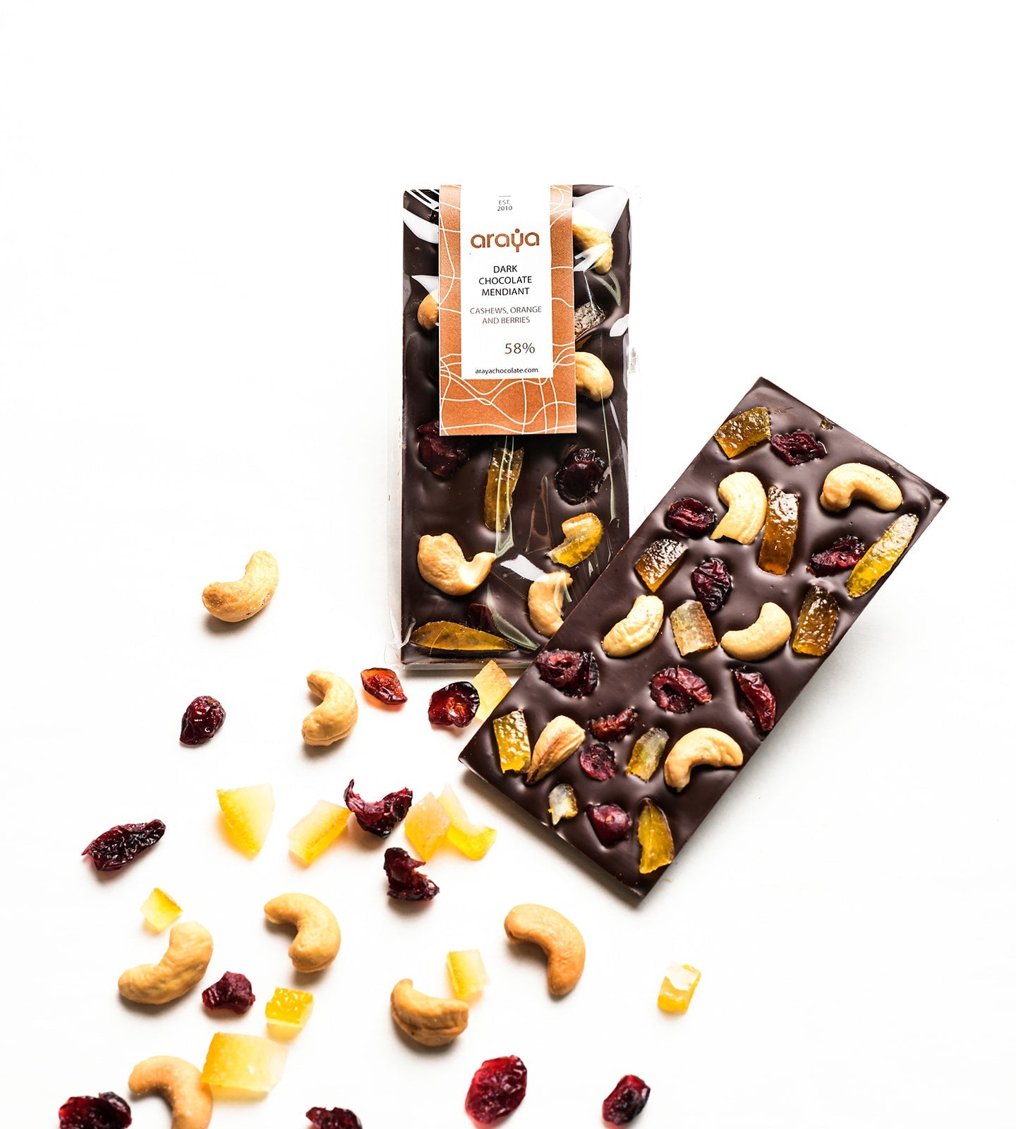 61% Venezuelan dark chocolate studded with cashews, candied Sicilian orange strips, and cranberries.